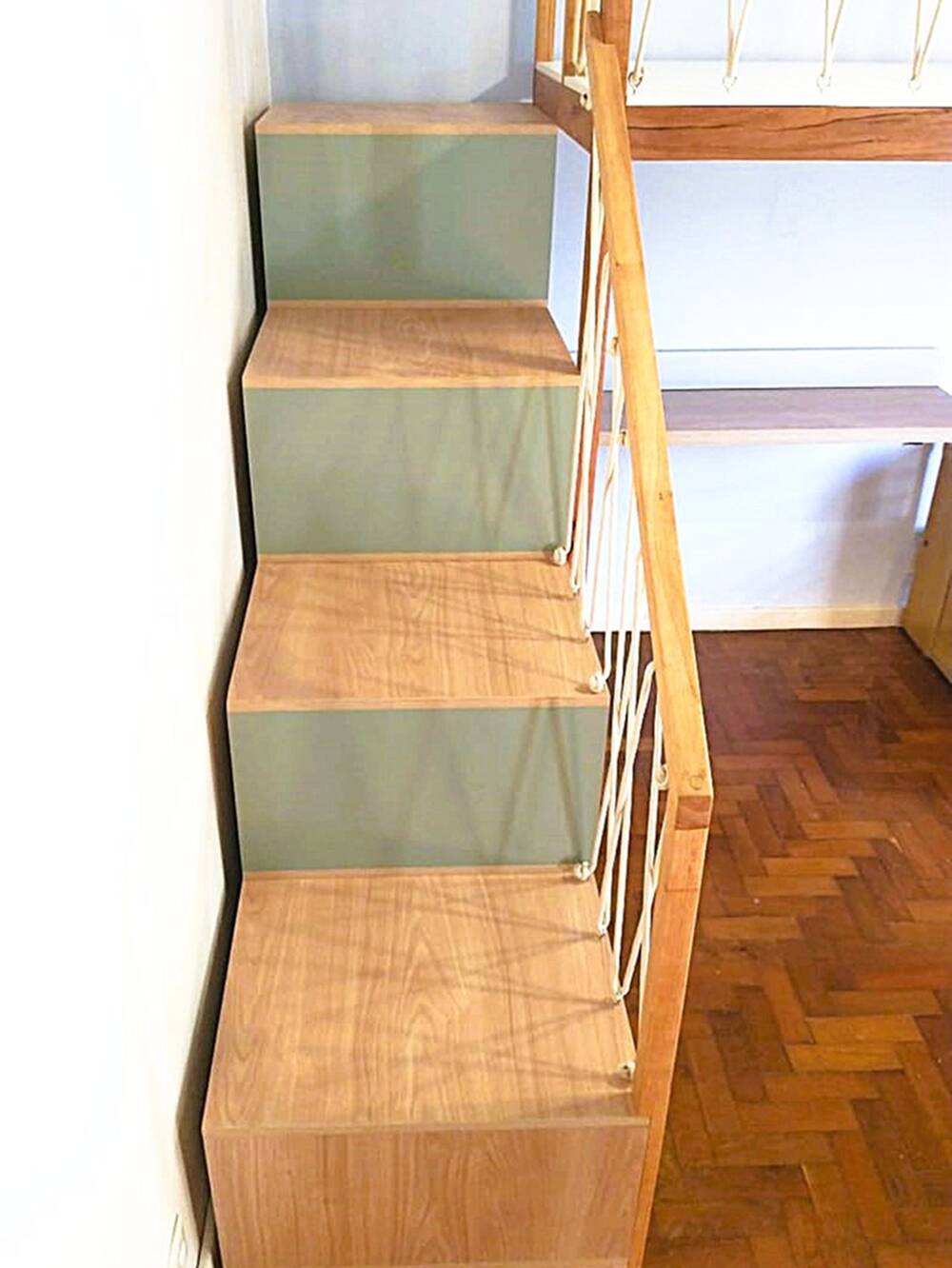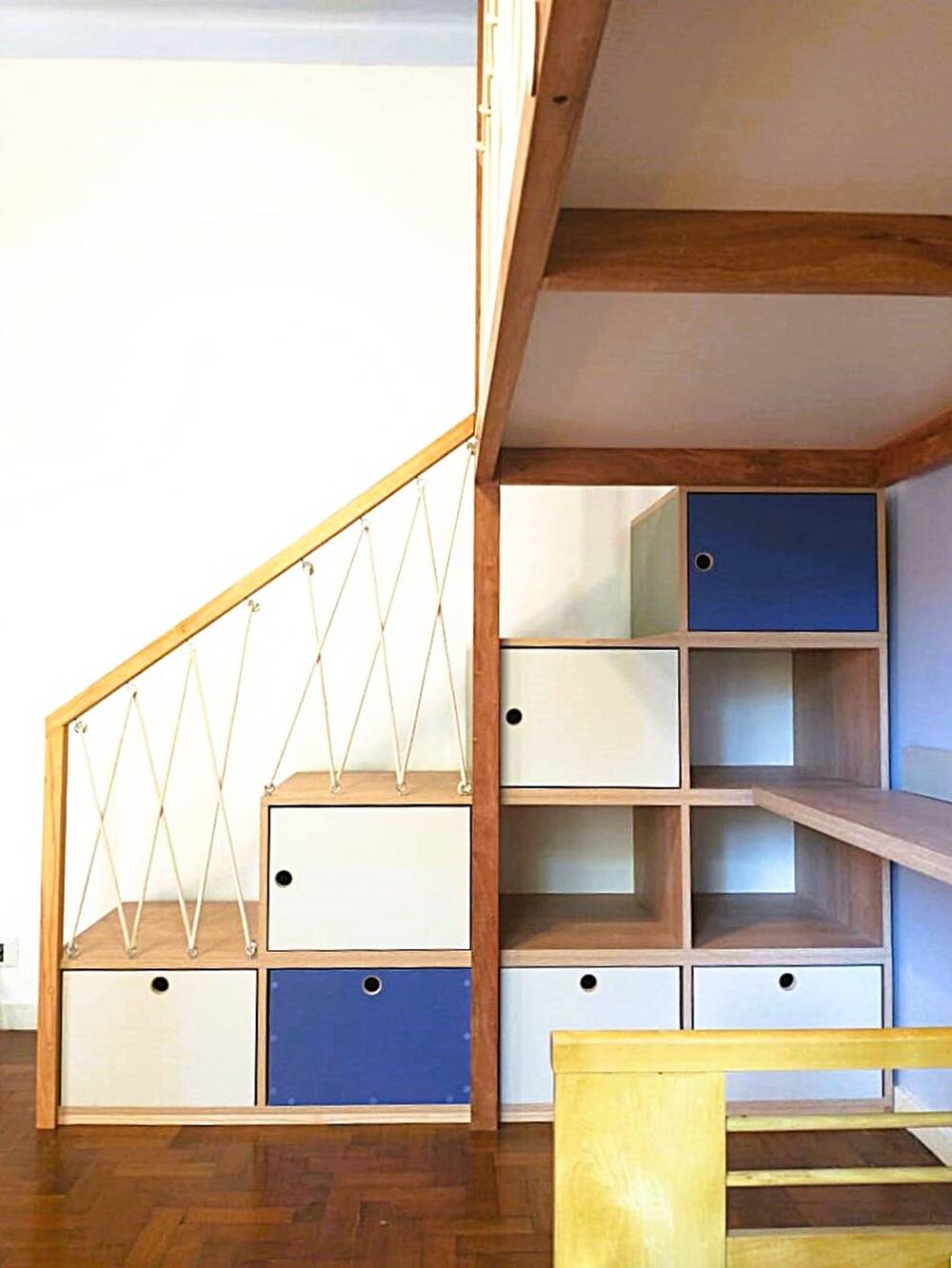 Pero eso no es todo: el acceso es una escalera modular multifuncional que esconde un arsenal de cajones y estantes para organizar juguetes, libros y tesoros. Para dibujar, simplemente un escritorio secreto (rebatible), que acompaña el área de descanso. Listo, entonces …. ¡a crear!