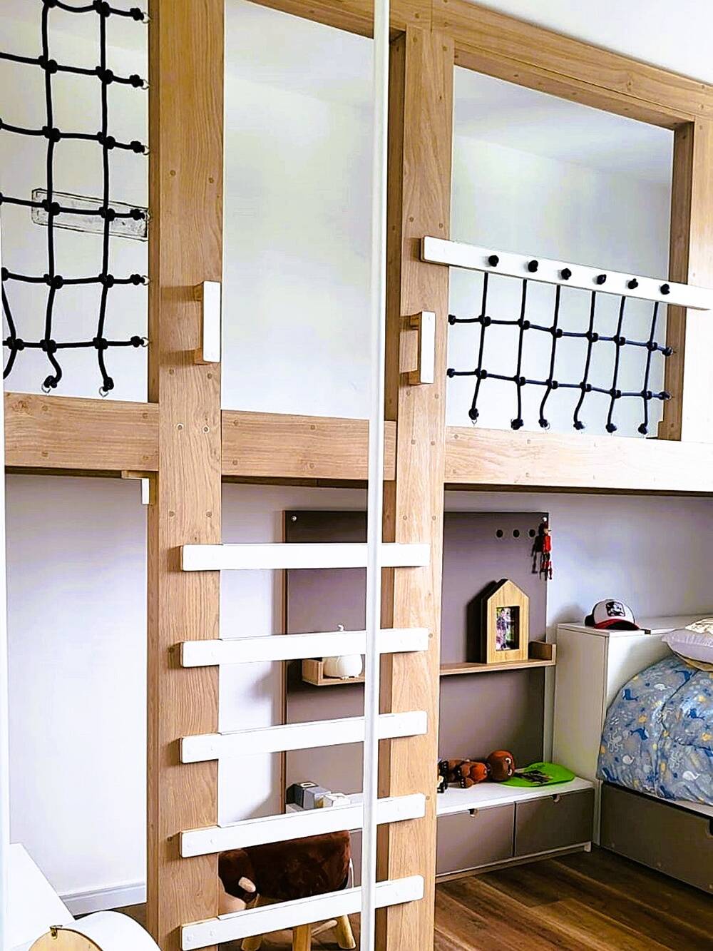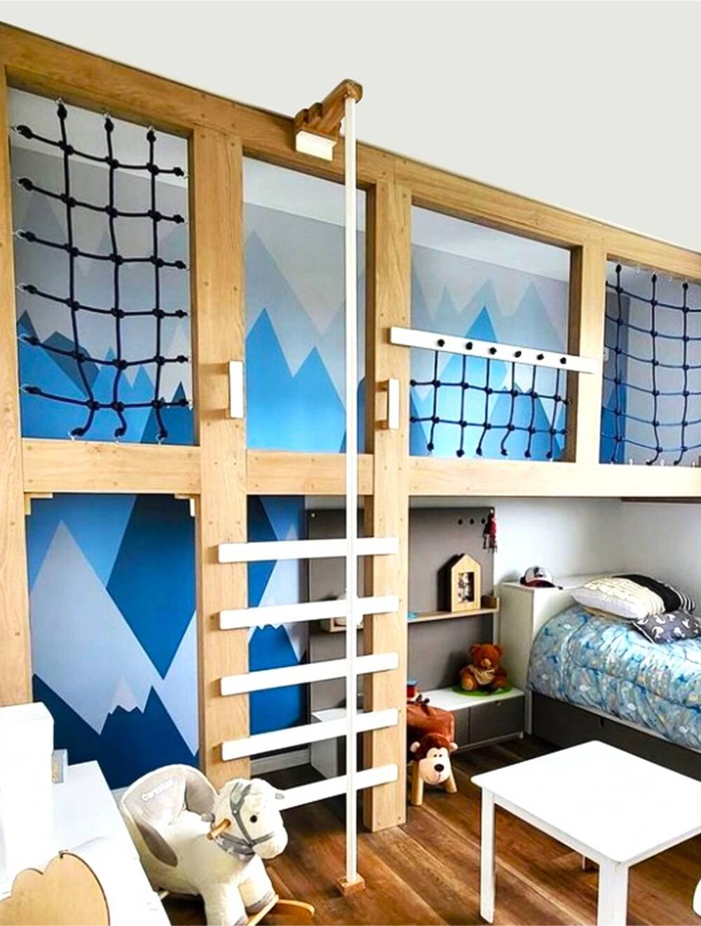 Una habitación que combina descanso y juego en un mismo espacio lleno de magia. El corazón es un entrepiso de madera clara, con escalera y pared de escalada, que convierte el cuarto en un verdadero campamento de exploradores. Abajo, la cama y el guardado se integran de forma práctica y acogedora.