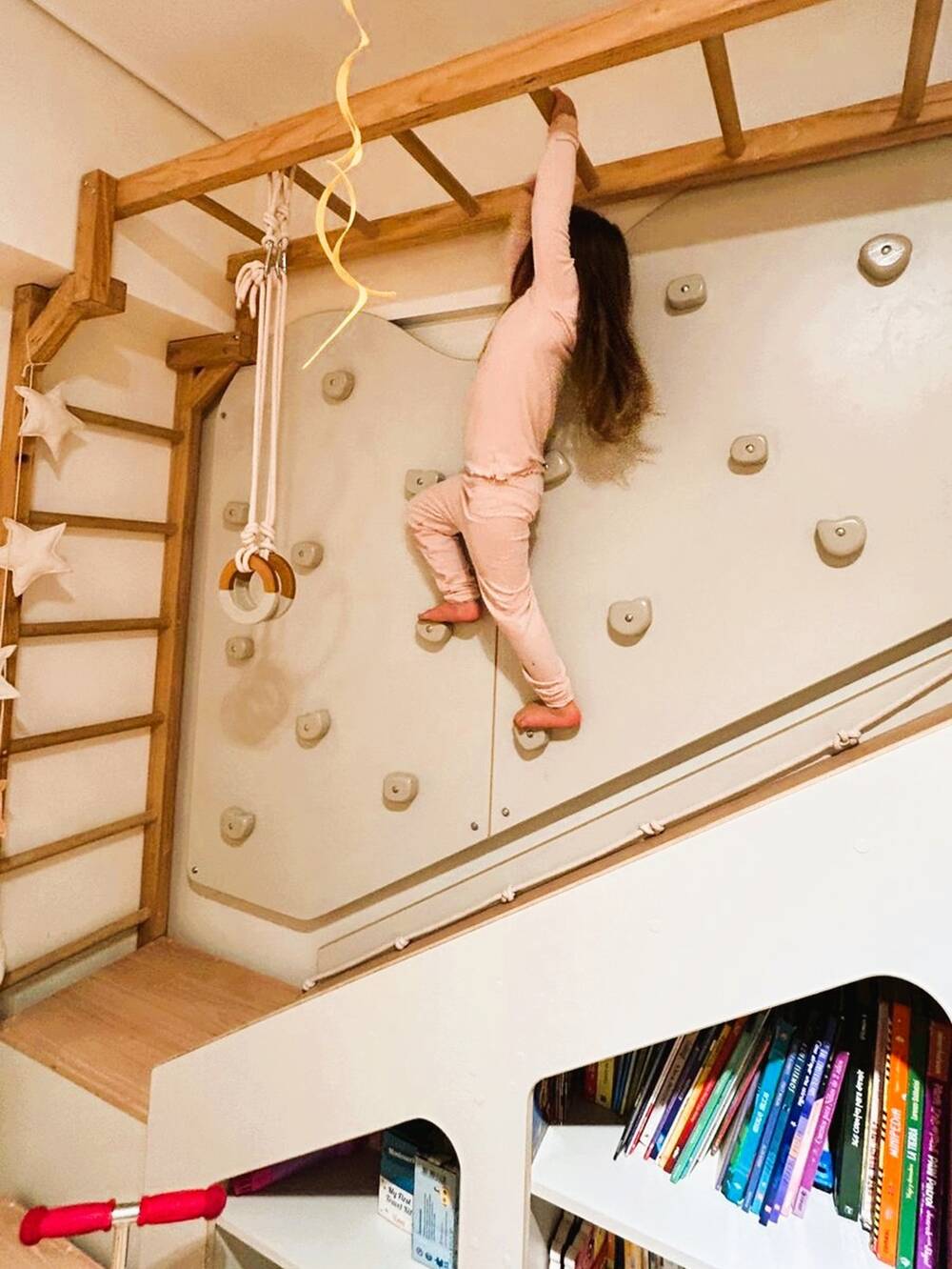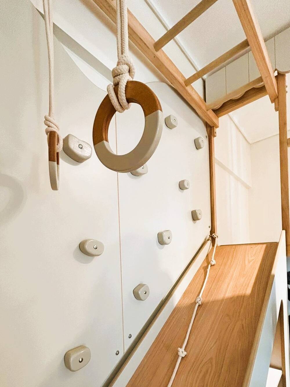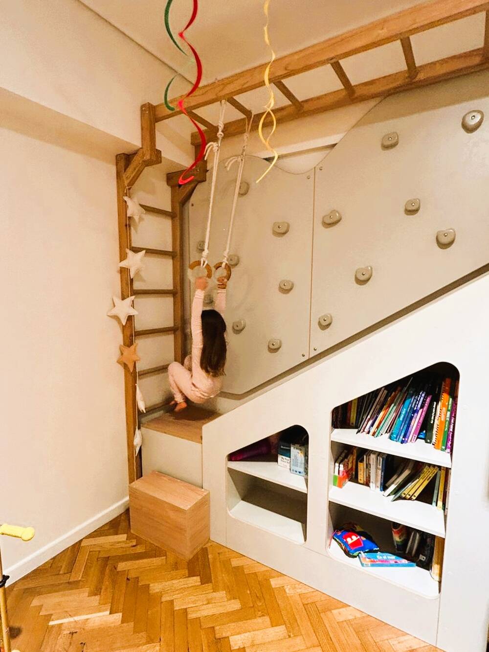 Pensado para explorar sin límites, dentro de un ambiente sereno y luminoso. Con palestra, sogas, anillas, un divertido deslizador y la incorporación de una polea, que lleva y trae tesoros. Éste espacio invita a moverse, imaginar y compartir.