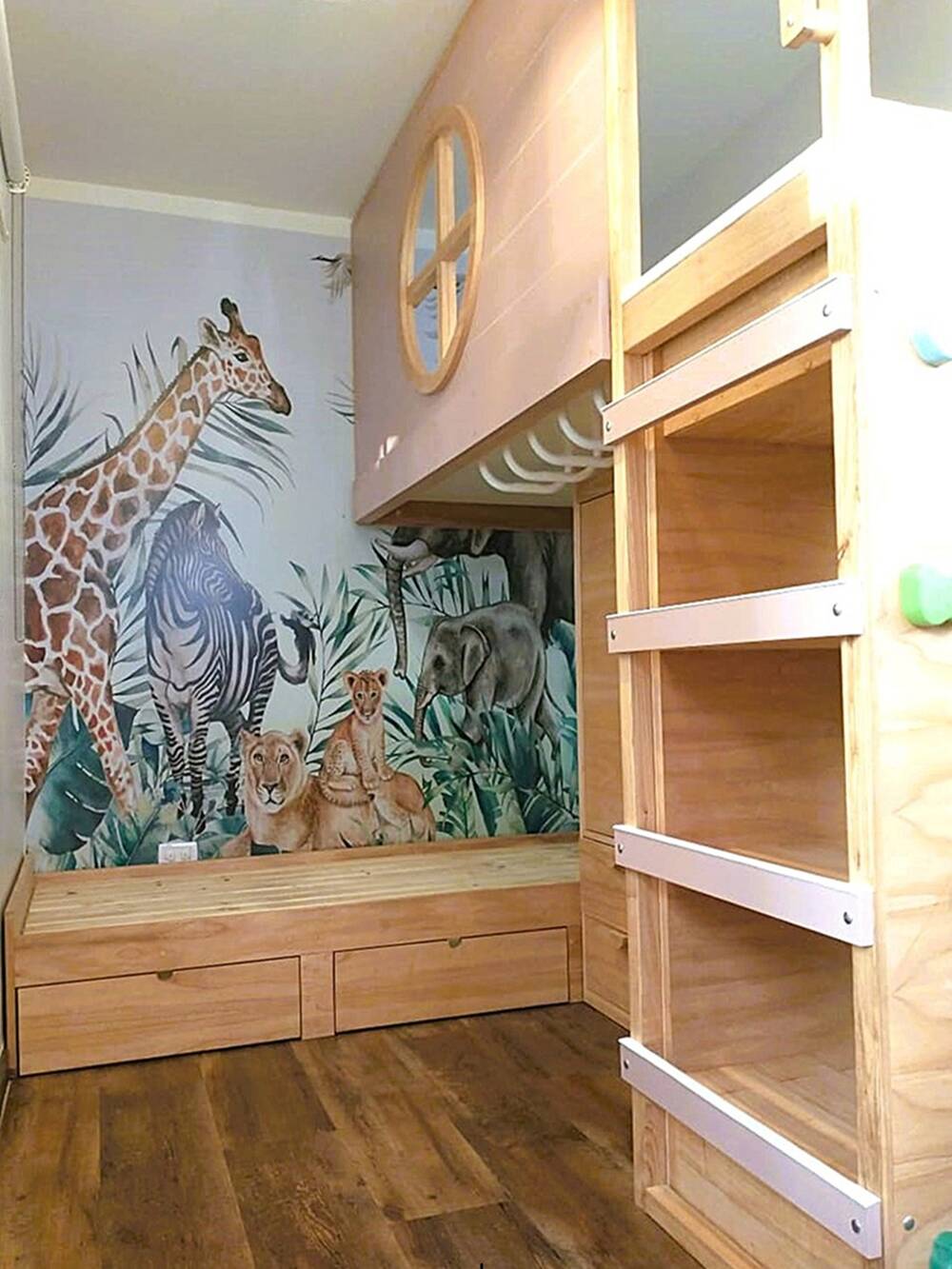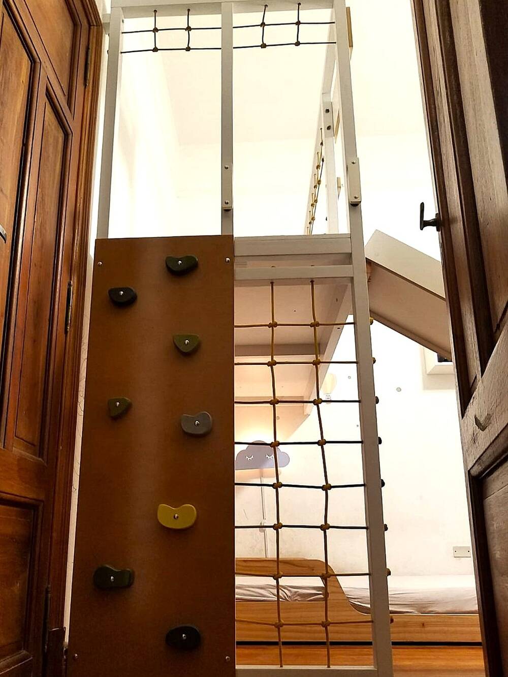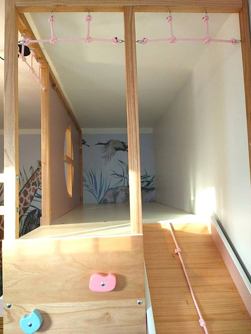 La diversión nunca se detiene con el tobogán y la palestra, mientras que la escalera con guardado y los cajones mantienen todo en orden. Un espacio donde el juego, la comodidad y la imaginación conviven cada día.
