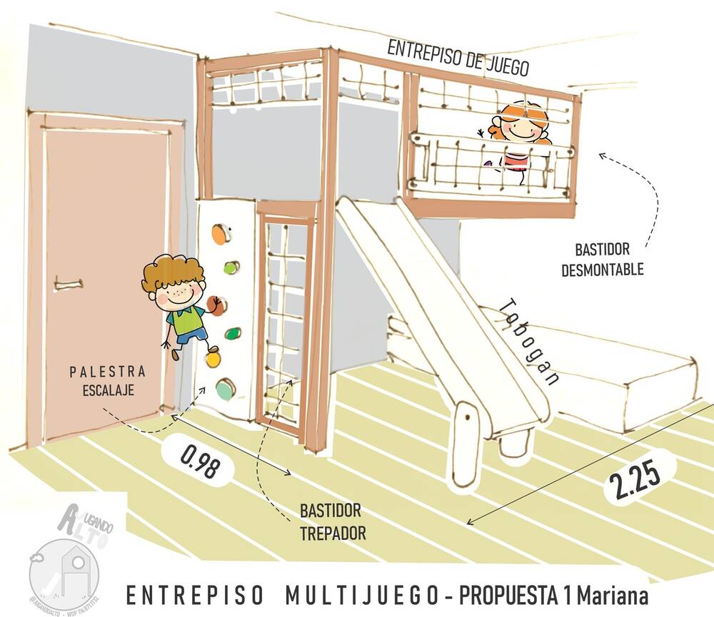 Un diseño que combina descanso y diversión en un solo espacio. Éste entrepiso eleva la cama, para optimizar la habitación y crea una experiencia de juego única: subir por la palestra ó el trepador de soga y deslizarse por el tobogán.