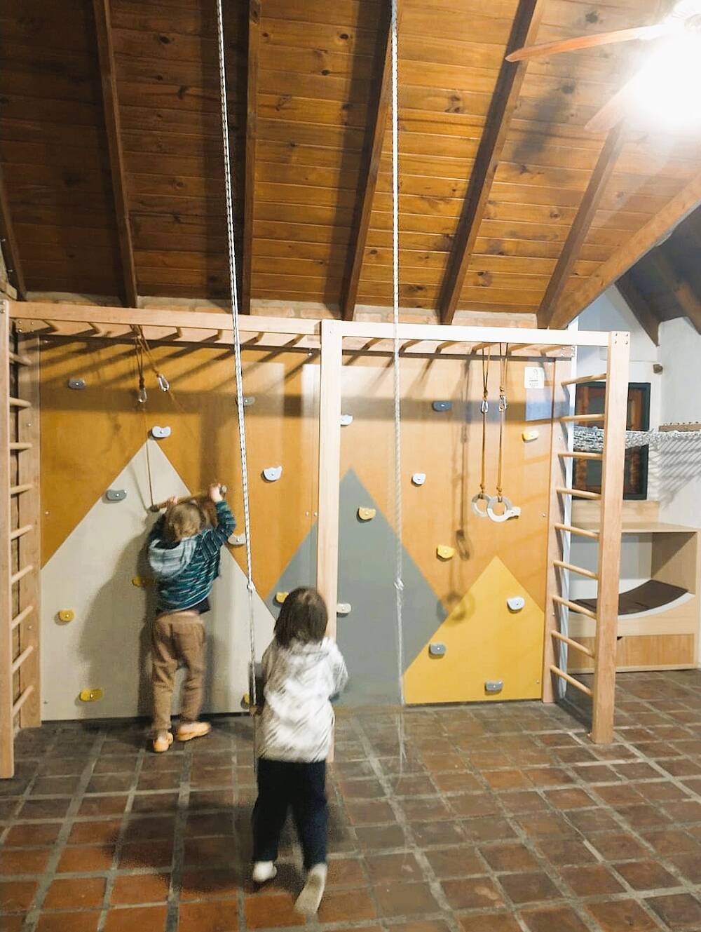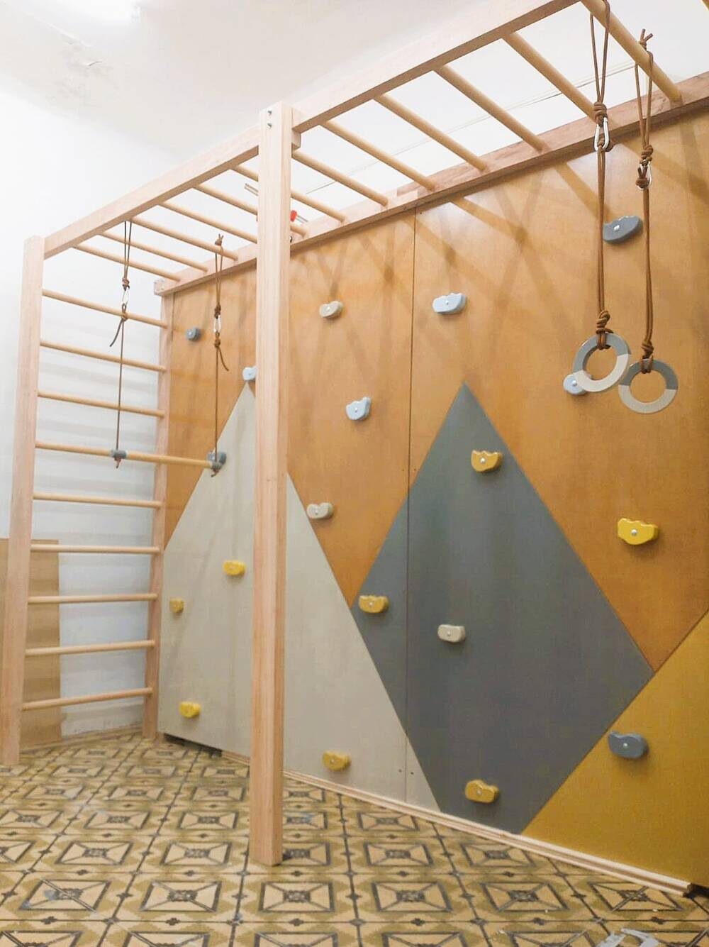 En este altillo diseñamos un espacio único, donde la palestra y el trepador se convierten en protagonistas, con su divertido diseño de montañas. Un rincón pensado para moverse, trepar y desafiar la destreza, con sogas, anillas y escaleras laterales que invitan al juego libre.