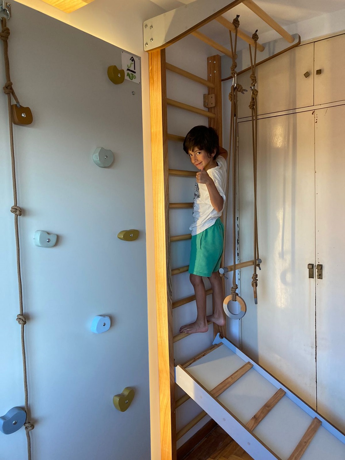 Convertimos esta habitación, en un espacio para descargar energía a pura diversión! Este diseño integra un gimnasio sensorial completo, perfecto para dos hermanos que necesitan mucho movimiento.