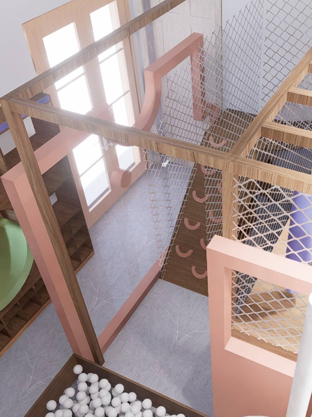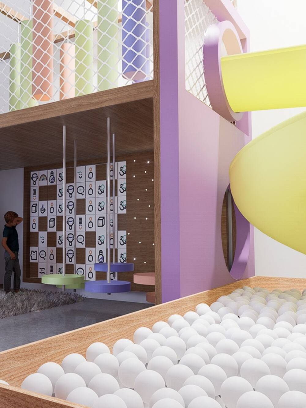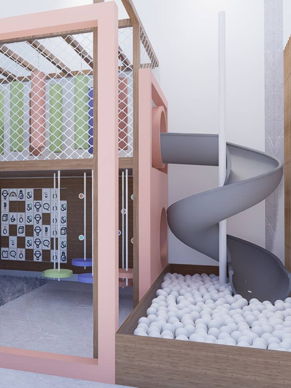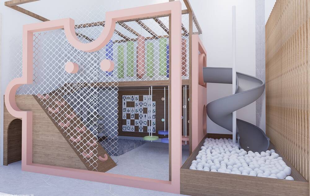 El espacio integra rampa trepadora, puente elevado, redes de protección, panel sensorial y almohadones como cuentas. Aportamos rincones lúdicos, rematando con un tobogán en espiral, que finaliza en una amplia pileta de pelotas.