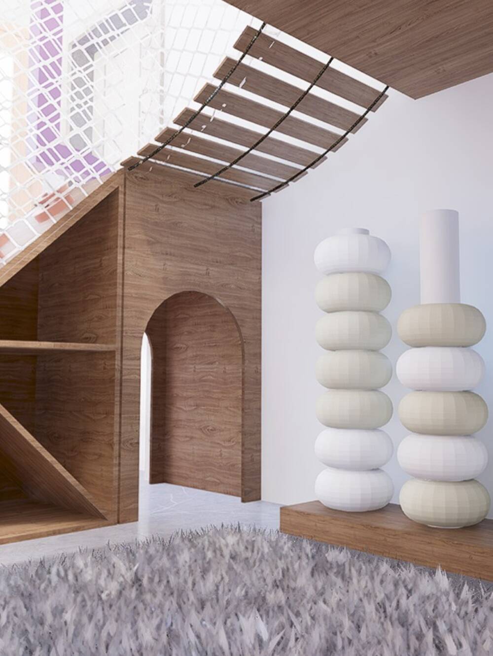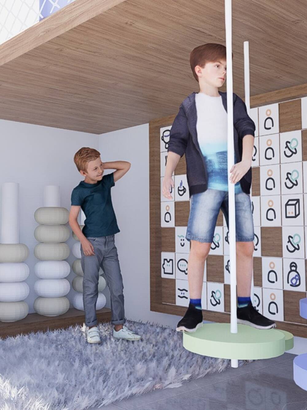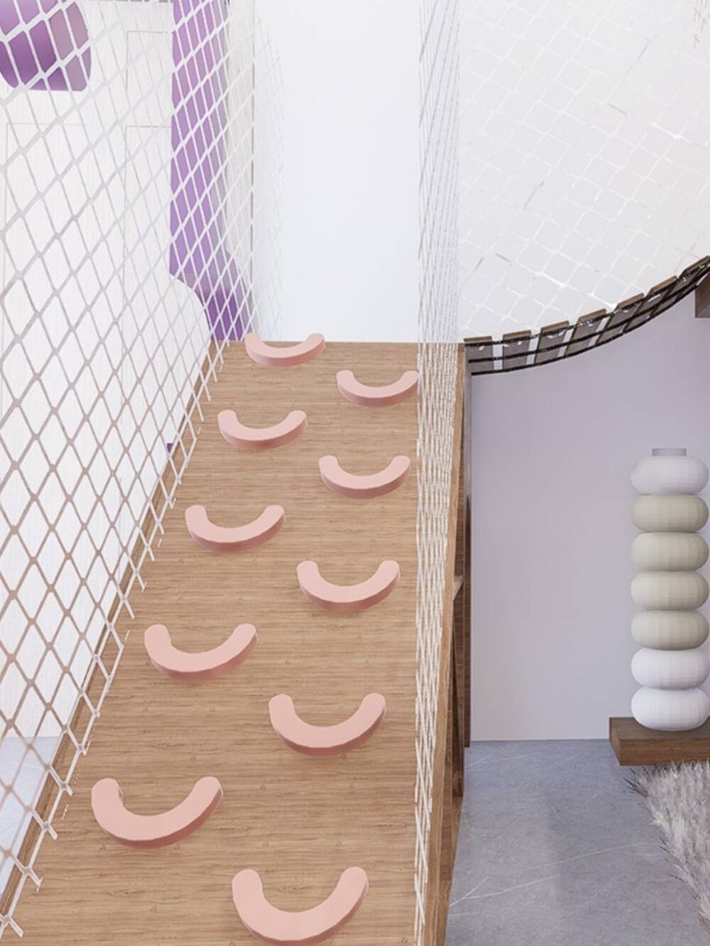 El espacio integra rampa trepadora, puente elevado, redes de protección, panel sensorial y almohadones como cuentas. Aportamos rincones lúdicos, rematando con un tobogán en espiral, que finaliza en una amplia pileta de pelotas.