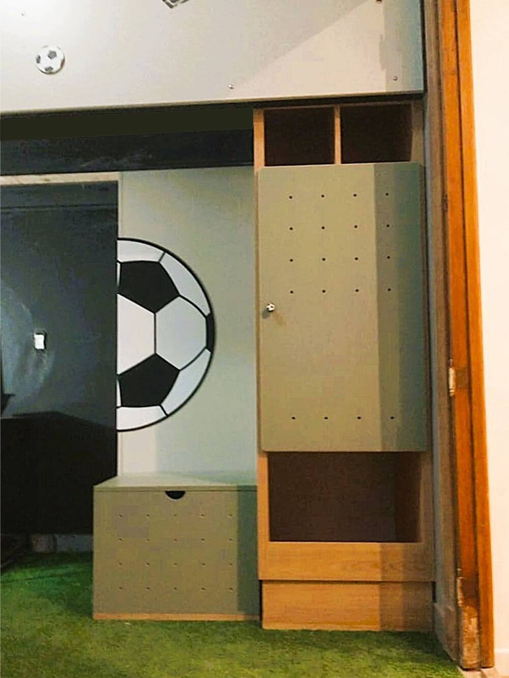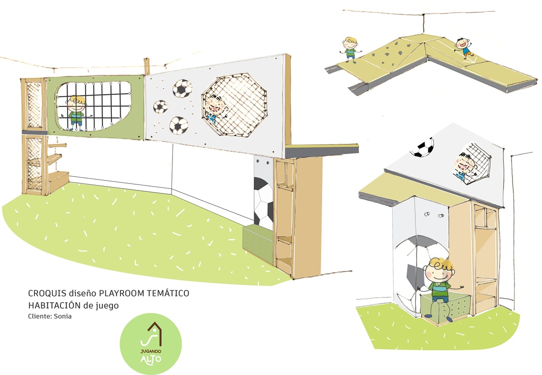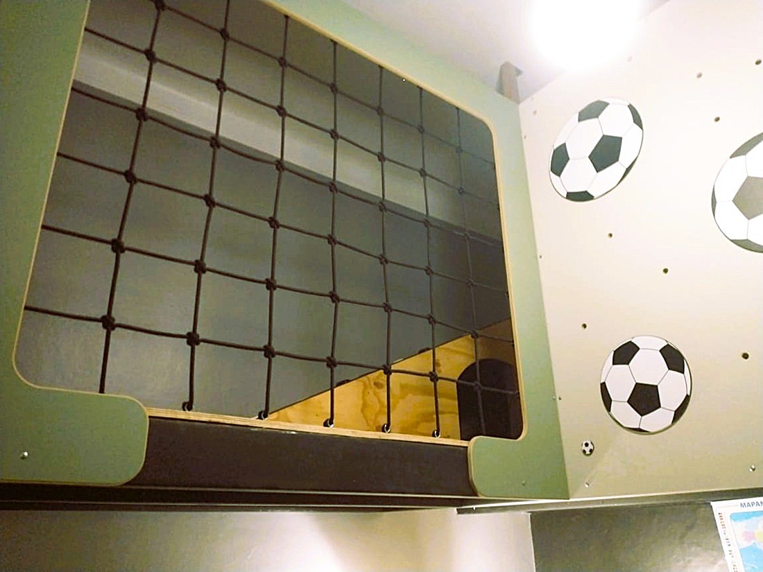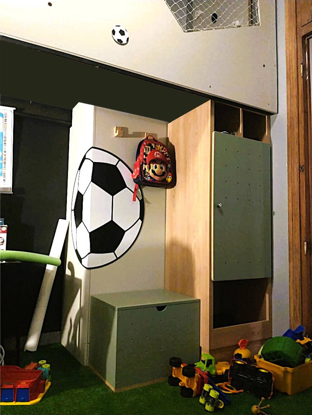 Un entrepiso en «L», pensado para pequeños fanáticos del fútbol. Elevamos el juego, al nivel superior, creando un nuevo sector de destreza, con tobogán y doble palestra, al mejor estilo pelotero.